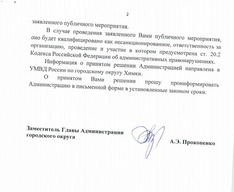 Заместитель главы Химок по безопасности Александр Прокопенко наконец прислал химкинским активистам ответ на их уведомление о проведении пикета в защиту прав граждан, который был запланирован на 5 ноября.