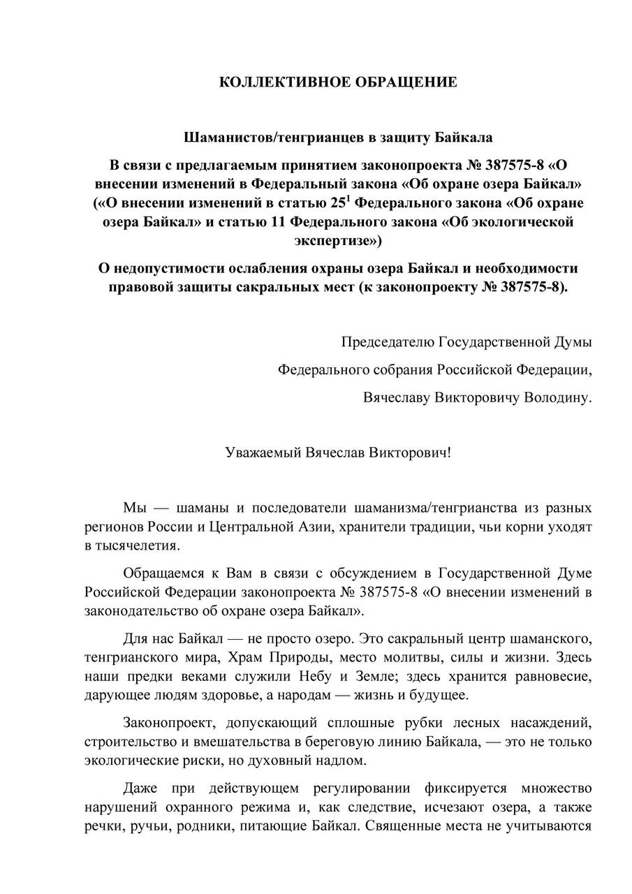Шаманы и сторонники тенгрианства (доисламская религия тюркских племен) обратились к председателю Госдумы РФ от имени сибирских и центральноазиатских народов. Они попросили "думцев" отклонить законопроект № 387575-8, который угрожает Байкалу.