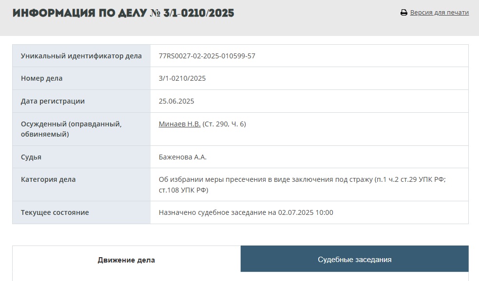 Более того - на сайте Тверского суда Москвы найдена карточка дела Минаева об избрании ему меры пресечения в виде помещения в СИЗО. Заседание по данному вопросу состоится 2 июля.