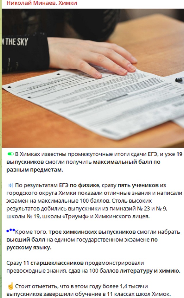 Последний пост в его телеграм-канале датирован 19 июня и посвящен тому, как химкинские школьники сдают ЕГЭ.