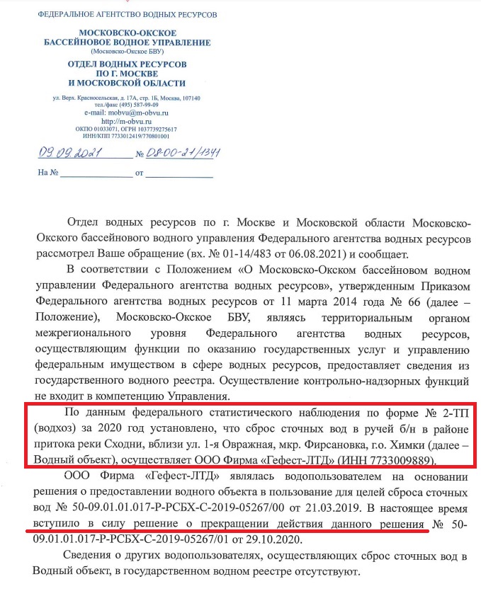 Сброс жидких отходов в ручей, впадающий в реку Сходню вблизи улицы Овражной, производила именно эта фирма - совершенно легально (!). Правда, разрешение, выданное "Гефест-ЛТД", истекло еще 29 октября 2020 года. Других же "водопользователей" у реки в этом районе нет.