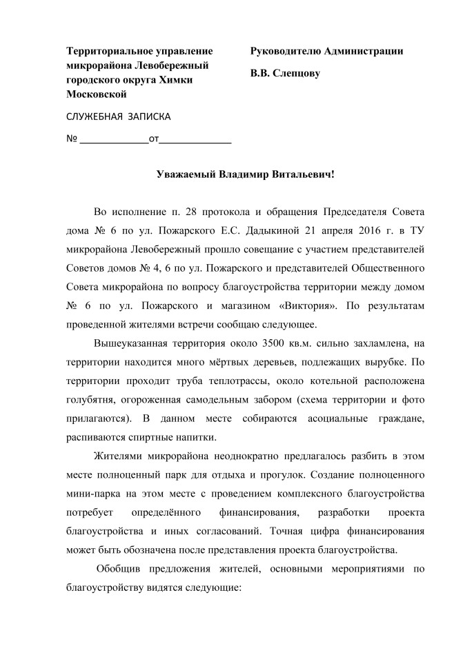 В связи с этим от главы теруправления Кузнецова в адрес Владимира Слепцова направлена служебная записка с просьбой решить данный вопрос, сообщает сайт Общественного совета Левого берега г.о. Химки.