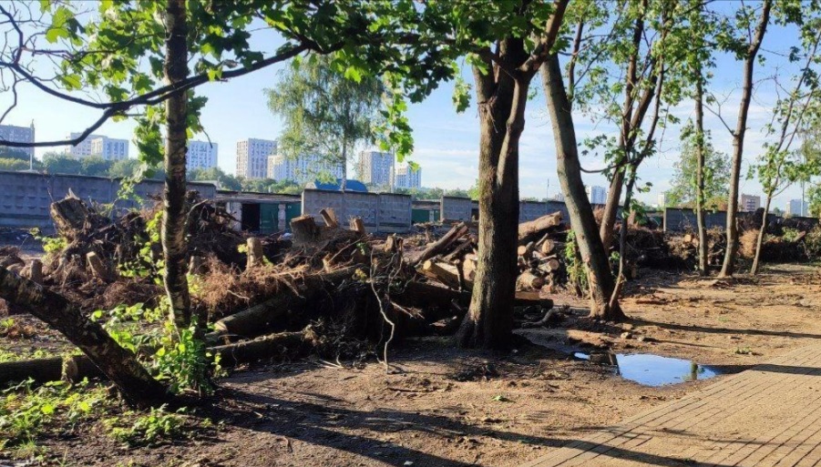 На данный момент деревья уже спилены на соседнем участке, прилегающем к железной дороге. А над самим сквером сгустились тучи - деревья постепенно огораживают, чтобы вскоре приступить к их уничтожению.