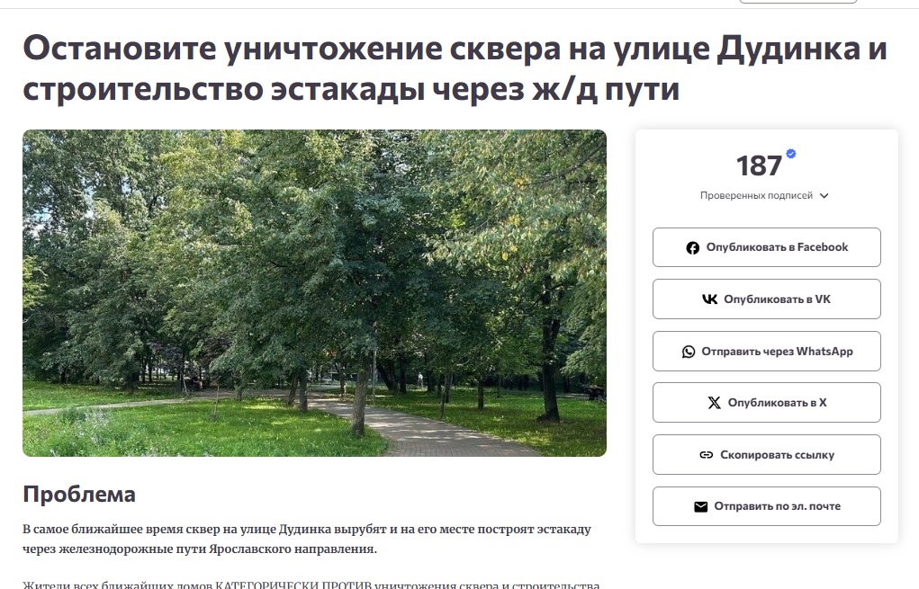 Жители Ярославского района Москвы встревожены последними новостями и запустили срочный сбор подписей в защиту сквера на ул. Дудинке - на данный момент петицию поддержали почти 200 человек.