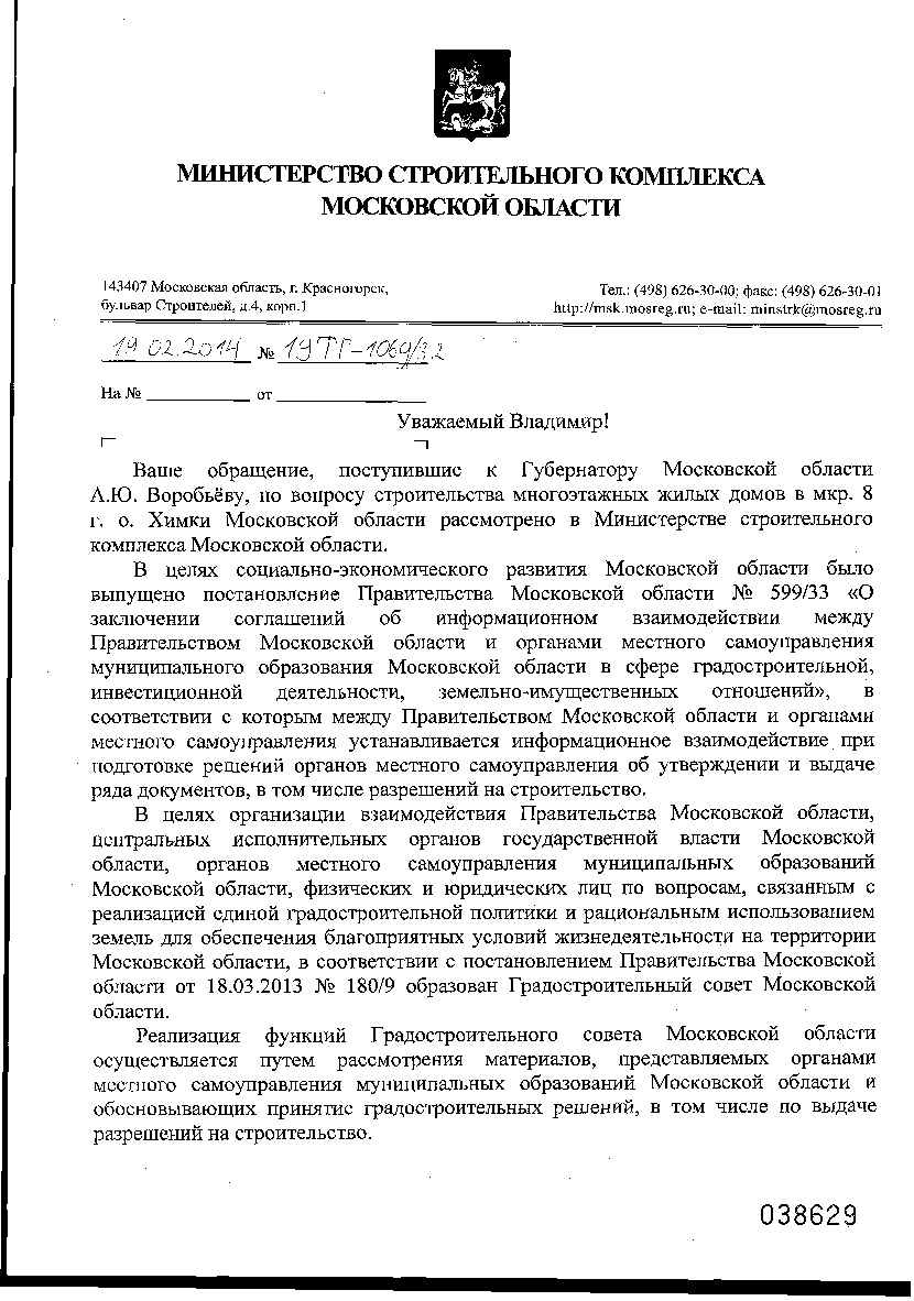 Владимир Ковтонюк, член Химсовета, получил вот такое письмо от Министерства строительного комплекса в ответ на свое обращение к губернатору Андрею Воробьеву: