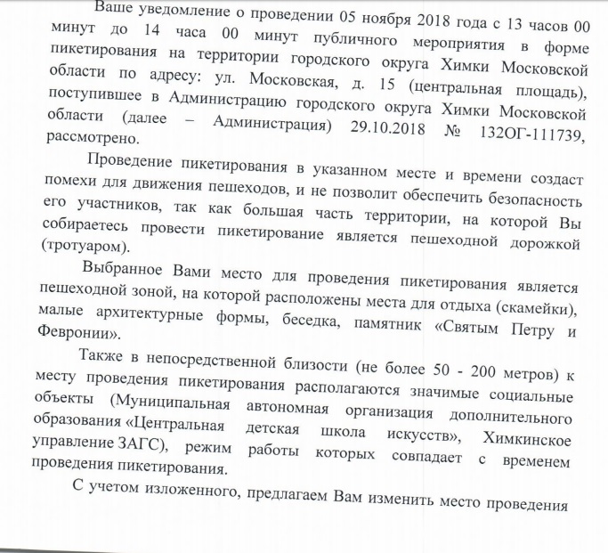 Заместитель главы Химок по безопасности Александр Прокопенко наконец прислал химкинским активистам ответ на их уведомление о проведении пикета в защиту прав граждан, который был запланирован на 5 ноября.