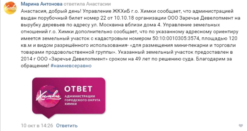 На инфощите написано, что деревья вырубаться не будут, однако администрация уже выдала ООО "Заречье Девелопмент" порубочный билет...