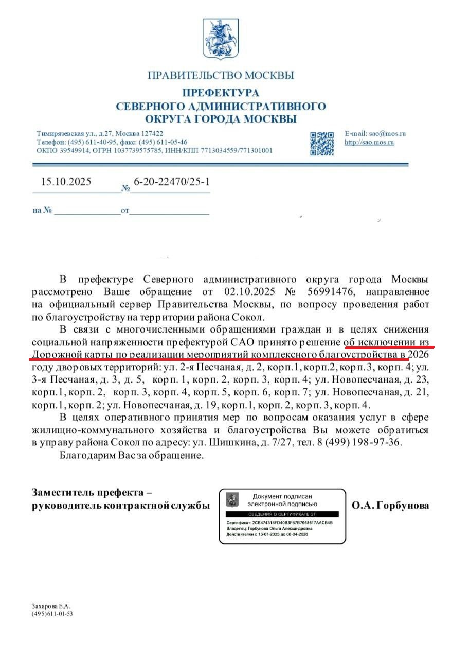 Инициативная группа отправила коллективное обращение муниципальным властям - в управу района, префектуру САО, а также депутатам. Они попросили "не утверждать и не принимать к реализации проект работ по ремонту/благоустройству территории жилой застройки (дворовых территорий) района Сокол". По мнению москвичей, предлагаемое благоустройство приведет лишь к ухудшению условий проживания граждан, нарушению их прав и росту общественного недовольства, что нежелательно в преддверие выборов в Госдуму.