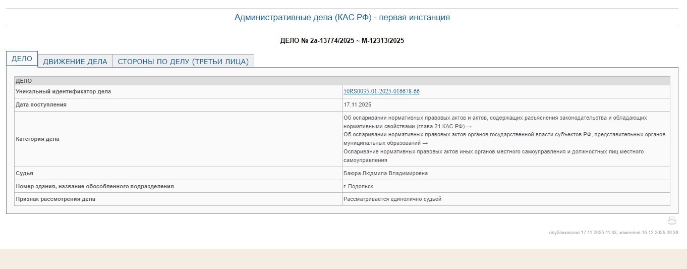 Муниципальный депутат Алексей Старчак и его помощница Евгения Егорова подали в суд на администрацию Подольска. Поводом для иска стало решение властей о застройке пос. Дубровицы многоэтажками - об этом Старчак рассказал в соцсетях.