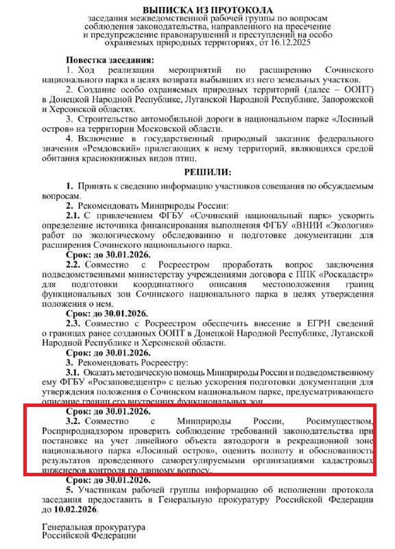 У Генеральной прокуратуры возникли вопросы к новой дороге, которую под Новый год запустили в Лосином острове. Канал "Эколог Жора Каваносян" опубликовал документ за подписью ведомства, где перечислен список задач, которые должны быть выполнены до 30 января. И среди них упоминается проверка соблюдения законодательства при постановке на кадастровый учет этой самой дороги.
