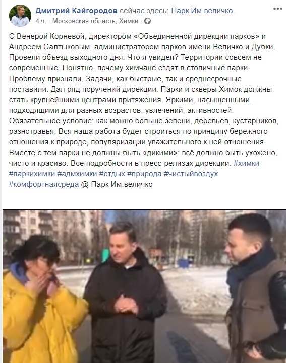 Замглавы Химок Дмитрий Кайгородов выразил неудовлетворенность нынешним состоянием этих двух парков и написал на своей страничке, что их нужно сделать "крупнейшими центрами притяжения", пообещав при этом "как можно больше зелени" и "бережное отношение к природе".