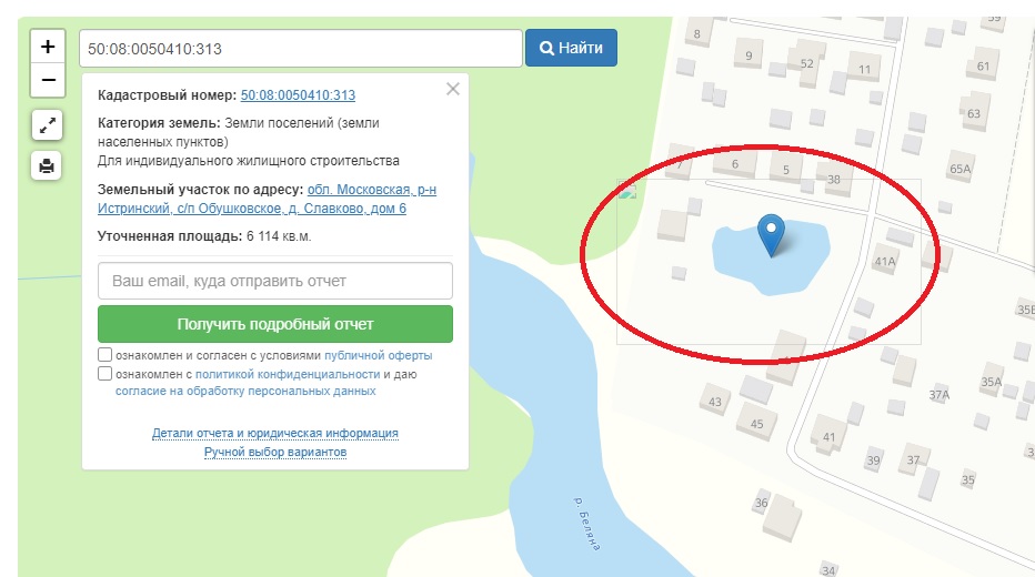 Смотрим Публичную кадастровую карту - и выясняется, что да, действительно, продаваемый участок содержит весь пожарный пруд целиком и "прихватывает" его береговую полосу. При этом назначение земли - индивидуальное жилищное строительство.