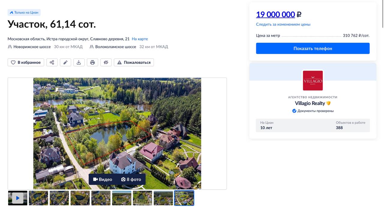 "Эксклюзивное предложение Villagio Realty. Загородный участок площадью 61,14 сот., назначение земли - ИЖС. Главные преимущества - цена и близость к Москве. Участок находится в деревне Славково в 25 километрах от МКАД. Деревня полностью газифицирована", - говорится в объявлении.