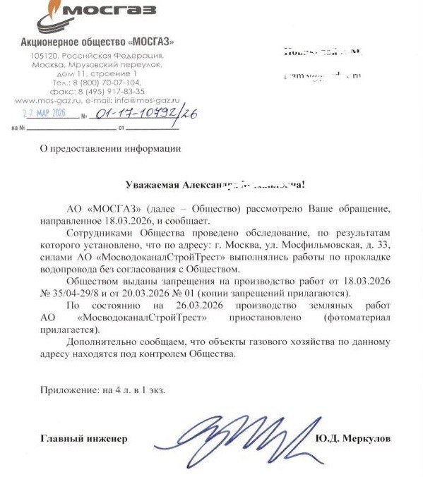 В Раменках, на Мосфильмовской, 33,"Мосгаз" остановил незаконные земляные работы - об этом сообщил политик Сергей Митрохин, опубликовав соответствующий документ. Газовое учреждение утверждает, что развернувшаяся на придомовой территории деятельность с ним не согласовывалась и она запрещена.