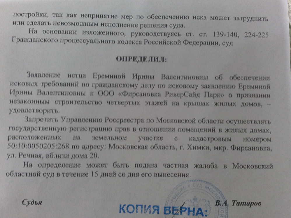 Жители Фирсановки г.о. Химки получили на руки определение об остановке работ застройщика "Риверсайдпарк" вблизи дома 20 по ул. Речной. Судья Химкинского городского суда Татаров принял решение удовлетворить требование истицы об обеспечительных мерах.