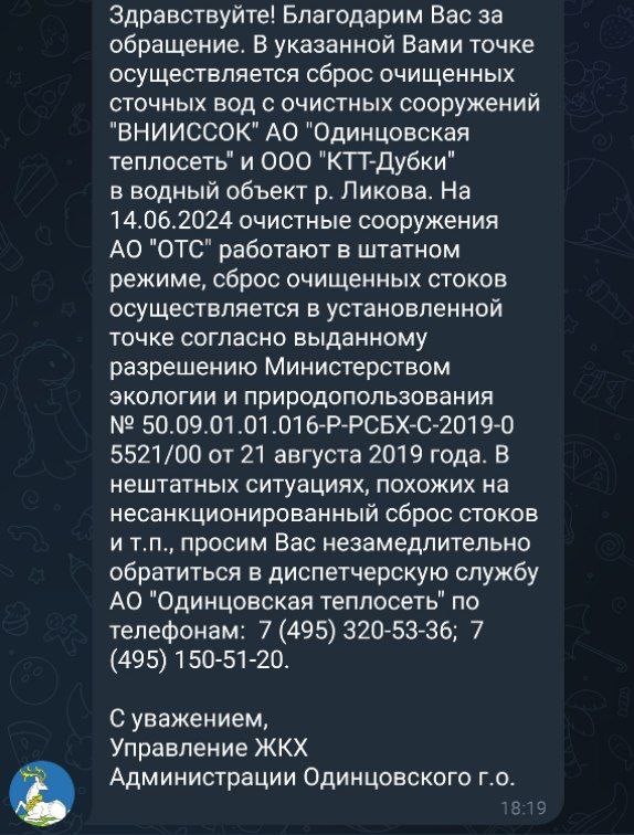 Тем не менее Одинцовская администрация считает, что никаких "несанкционированных сбросов" на самом деле не происходит, а очистные сооружения "работают в штатном порядке".