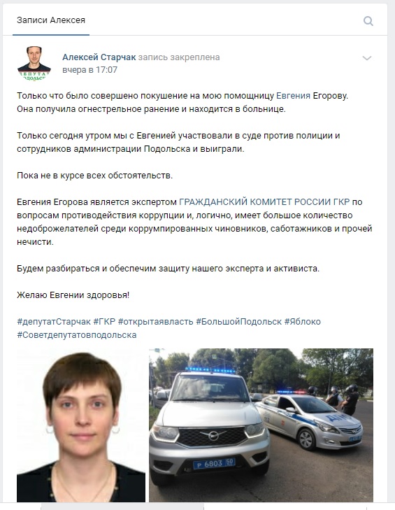 5 июля вечером депутат г.о. Подольск от "Яблока" Алексей Старчак сообщил о покушении на свою помощницу - Евгению Егорову, которое произошло в Видном. Неизвестный подошел к Евгении в общественном месте и выстрелил в нее. С огнестрельными ранениями бедра активистку госпитализировали, о состоянии на данный момент не сообщается.