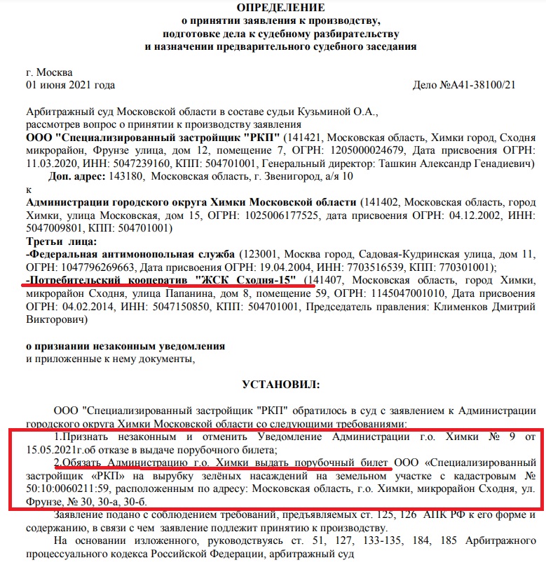 Истцом выступает инвестор строительства - ООО "Специализированный застройщик "РКП", а в качестве третьего лица указан потребительский кооператив ЖСК "Сходня", давно известный жителям г.о. Химки.