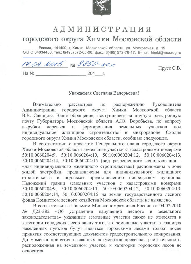Однако указанная информация вводит жителей в заблуждение относительно судьбы Сходненского леса, сообщили "Экообороне" защитники леса. Сходненский лес площадью "около 50 гектаров", который планируется наделить статусом "городские леса" после утверждения Генплана г. о. Химки, как заявлено в сообщении от имени администрации г. о. Химки, юридически не является одним земельным участком. В составе этой лесной территории в настоящее время сформировано 12 земельных участков общей площадью 30,5 га (из 46 га леса) с разрешенным использованием, предполагающим капитальную застройку, - многоэтажное жилищное строительство, индивидуальное жилищное строительство, административно-бытовое строительство.
