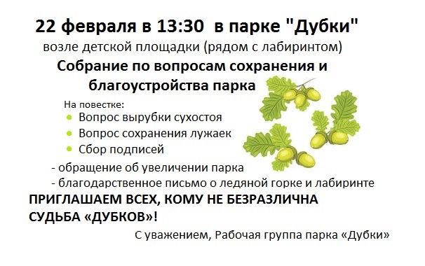 Защитники парка "Дубки" в Новых Химках проведут в воскресенье, 22 февраля, в 13:30, собрание и приглашают на него всех желающих, неравнодушных к судьбе парка.
