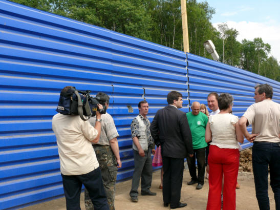 Местные жители, представители партий "Зеленые" и "Яблоко", вместе со съемочной группой "Вестей" пытаются переговорить с начальником стройки, чтобы узнать на каком основании ведется строительство и посмотреть разрешительные документы. Но им не открывают, отвечая что "начальства нет"...