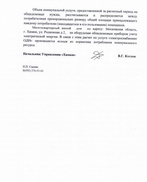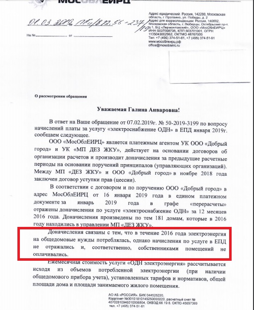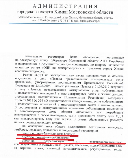 Жители Химок получили очередные ответы на свои обращения, связанные с добавлением в ЖКХ-счета дополнительных крупных сумм за общедомовые нужды (ОДН). И ООО "Мособлеирц", которое собирает жилищно-коммунальные платежи с химчан, и администрация г. о. Химки не горят желанием отказываться от очередных поборов, прибыль от которых составит сотни миллионов рублей, и поясняют, что они якобы законны.