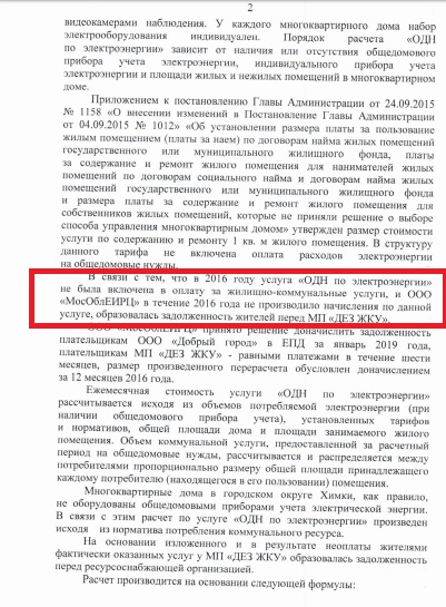 Нам очень повезло по скандальной теме начисления ОДН за электронергию и мы хотим поделится этим со всеми! Все дело в том что наш дом в г. Химки ул. строителей 3 - запрашивал у МП "ДЕЗ ЖКУ" отчет об использовании денежных средств как раз за 2016! В отчете есть строка п.3.1.3 - расходы на оплату электрической энергии в целях содержания общего имущества = 159 771.14 руб. Таким образом выставление дополнительных счетов по электроэнергии за ОДН 2016 - является не обоснованным! Причем сумма за ОДН 2016 практически совпадает !! У нас в доме 108 квартир умножаем на 245.88 р. и на 6 месяцев = 159 330 р. Документы прилагаются!