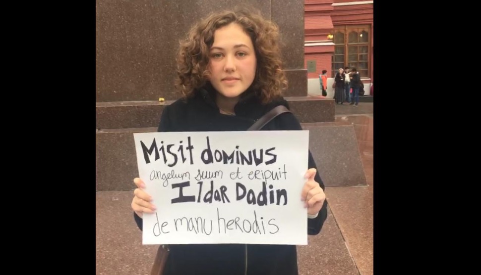 В сентябре этого года юная гражданка США, 20-летняя студентка Чикагского университета Ариэлла Кац вышла на Манежную площадь Москвы с плакатом за освобождение политзаключенного Ильдара Дадина. Ее задержали полицейские... но, очевидно, не зная, что с ней делать, вскоре отпустили, пригрозив лишением визы. Ариэлла не испугалась и немедленно сделала второй плакат. Опять вышла на Манежку... и тут же была снова задержана.