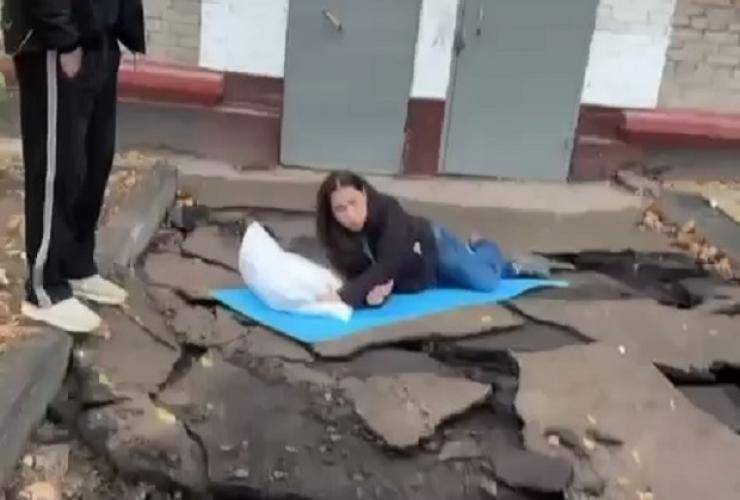 Благоустройство в применением тяжелой техники в московском районе Марфино не стихает ни днем, ни ночью, невзирая на закон о тишине. У одной из местных жительниц лопнуло терпение - она принесла подушку и одеяло, улеглась посреди разгромленного двора и заявила, что будет спать прямо здесь.