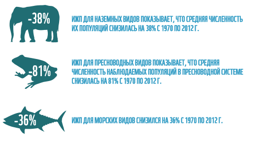 Главным показателем жизни на Земле – Индексом живой планеты - является изменение численности популяций диких животных в природе. Отслеживанием этих данных занимается Лондонское зоологическое общество. По его подсчётам? за последние пятьдесят лет численность видов животных, обитающих на земле уменьшилась? на 38%, животных, обитающих в пресноводных водоёмах? – на 82%, а животных, обитающих в морях и океанах? сократилась на 36%.