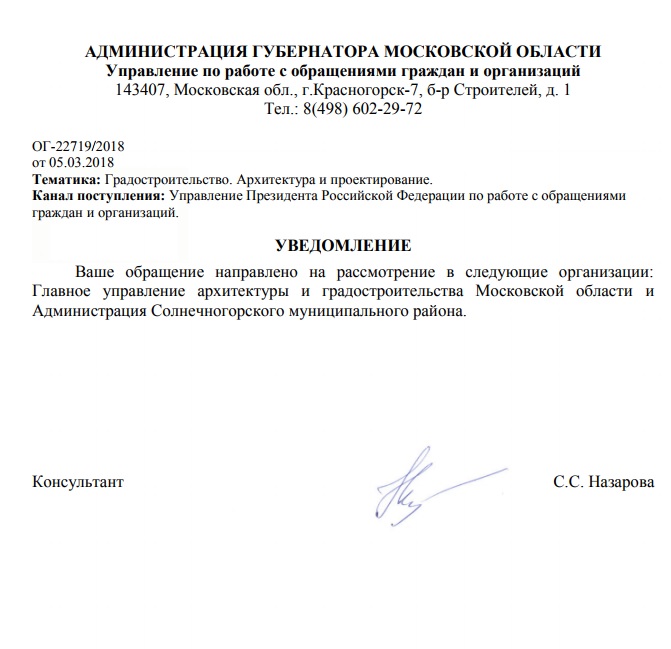 Администрация Президента РФ перенаправила данное заявление на рассмотрение в правительство Московской области. Оттуда его переслали в администрацию Солнечногорского района и в Главахитертуру Московской области. Будем ждать ответа.
