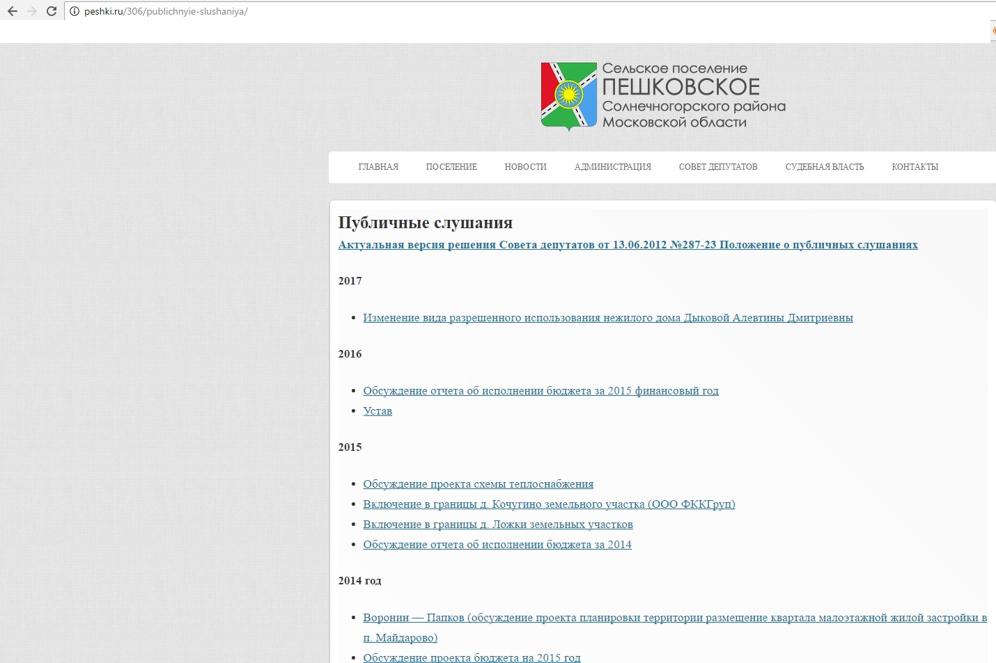Объявлений о слушаниях по Генплану Пешковского нигде нет. Ни на сайте Солнечногорской администрации, ни на сайте Пешковского поселения не опубликовано постановление и.о. главы Солнечногорского района от 22.02.2017 о назначении слушаний. Вот скриншоты для подтверждения: