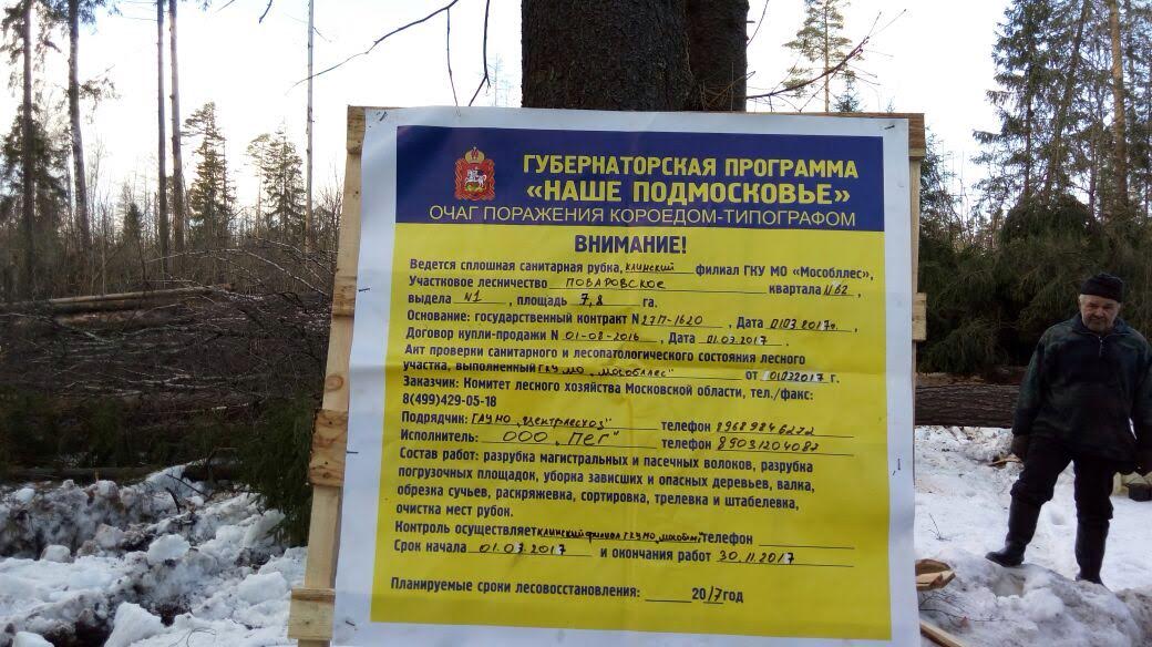 Установлен инфощит, согласно которому вырубку ведет та же компания (ООО "ПЕГ"), которая уничтожила сотни гектаров леса в Поварово - под видом санитарных рубок, но на самом деле под промзону.