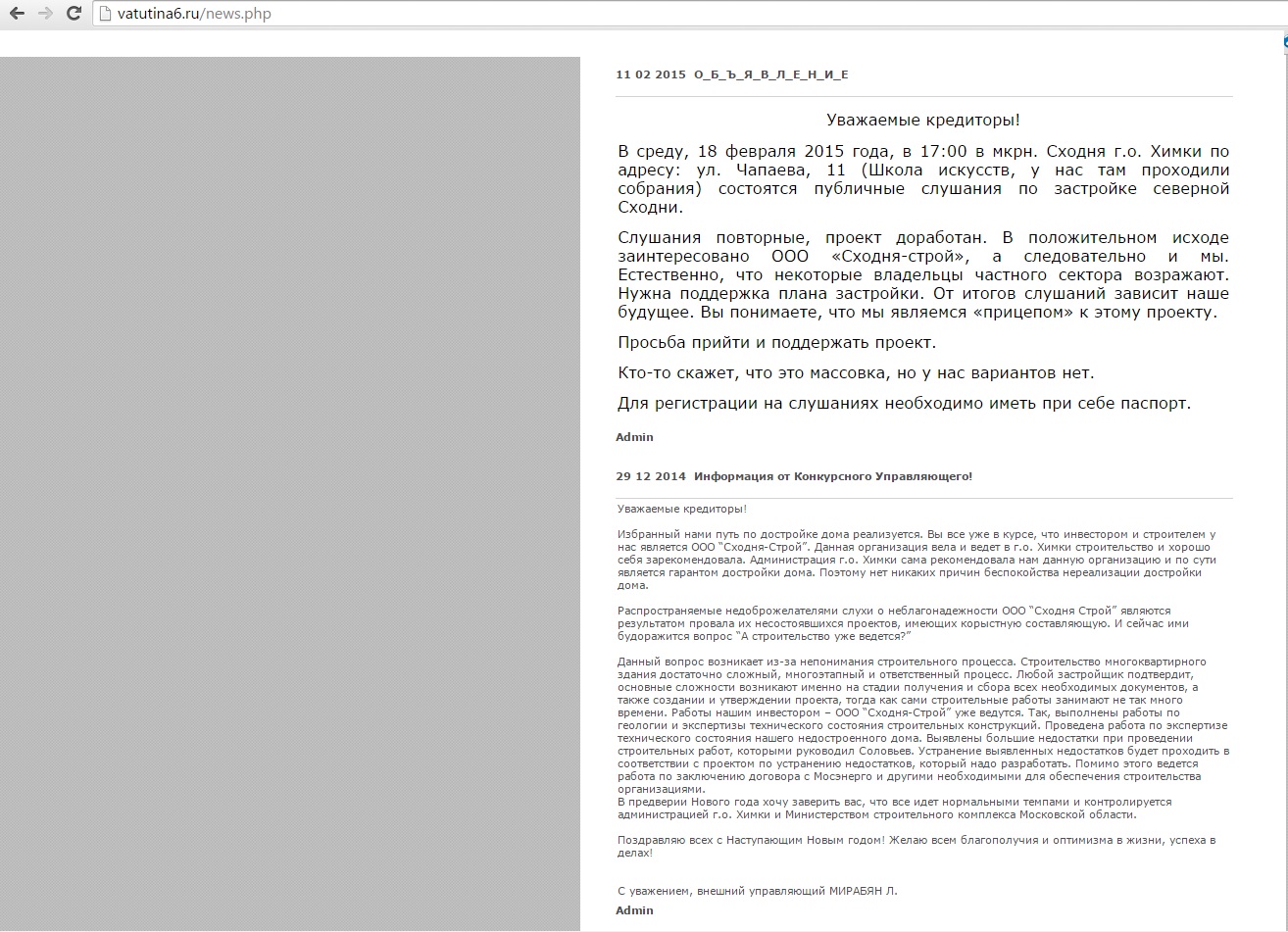 Возможно, Нырков при решении вопросов обманутых дольщиков в мкр Сходня лоббировал интересы "своей" компании, вовлекая дольщиков в "массовку за строительство" на публичных слушаниях 18 февраля 2015 года?