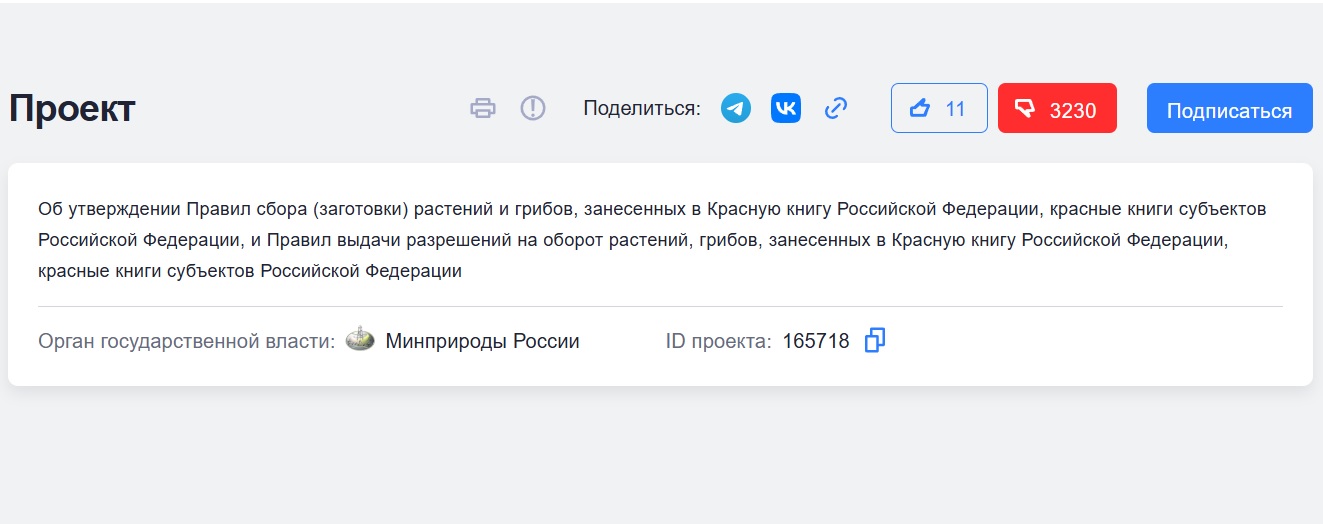 На обсуждение законопроекта отведены считанные дни, экологи призывают срочно проголосовать против (нажать "палец вниз"), авторизовавшись через "Госулуги". На момент написания этой новости поддержали законопроект всего 11 человек, а не поддержали - 3230.