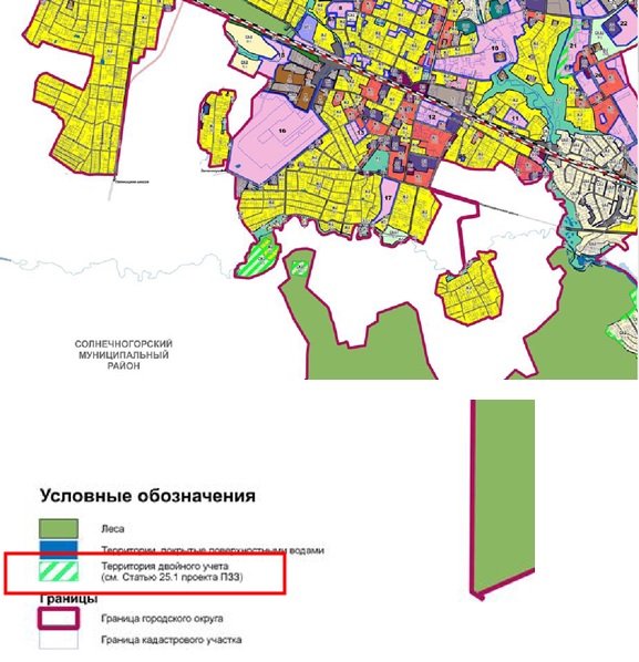 В картах Правил землепользования и застройки (ПЗЗ) образца 2017 года этот кусок земли показан как участок двойного учета, то есть полностью накладывается на земли Гослесфонда: