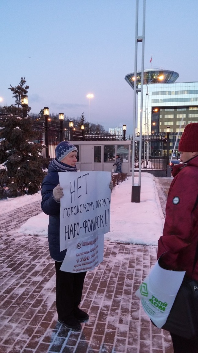 Продолжаются протесты и в поселениях Наро-Фоминского района. Сегодня в Красногорске, перед зданием правительства Московской области, проведены пикеты жителей поселка Селятино, митинговавших в начале декабря.