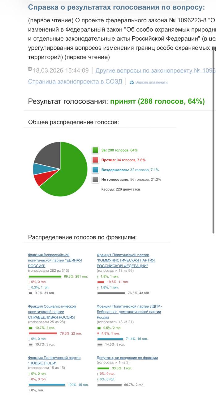 "За" проголосовали 288 депутатов, "против" - 34, воздержались - 32. При этом значительная часть избранников не участвовали в голосовании. Фактически решение в пользу законопроекта было обеспечено фракцией "Единая Россия", которая поддержала инициативу почти единогласно - воздержался только Вячеслав Фетисов, который также трудится председателем Всероссийского общества охраны природы. У других фракций преобладала сдержанная или отрицательная позиция по отношению к законопроекту: в КПРФ 1 был "за", 11 - "против", 1 воздержался; в "Справедливой России" - 3 "за", 22 "против"; ЛДПР - 2 "за", 1 "против", 15 воздержались; "Новые люди" - все 15 воздержались".