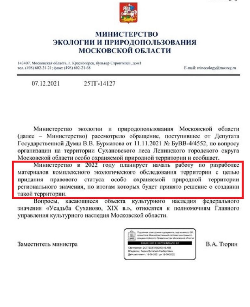 Летом этого года жители Ленинского округа подали в правительство Московской области заявку на придание статуса особо охраняемой природной территории Сухановскому лесу. К своей заявке они приложили результаты экологической экспертизы, проведенной на собранные ими средства и выявившей наличие в лесу 19 видов ценных растений и животных, занесенных в Красную книгу Московской области. Областное Министерство экологии рассмотрело эту заявку и сообщило, что решение будет принято в 2022 году, после того как лес досконально исследуют специалисты.