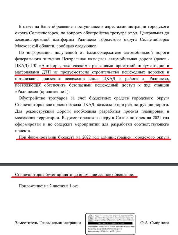 Оказывается, при строительстве развязки ЦКАД "Автодор" вообще не предусмотрел пешеходной дорожки и организации передвижения людей в районе станции Радищево. При этом в администрации г.о. Солнечногорск денег на эти нужды также не выделено. Однако жалобы жителей будут "приняты во внимание" при формировании солнечногорского бюджета на следующий год. Так что, возможно, в 2022 году проблема все-таки будет решена. Таков, если вкратце, ответ администрации Солнечногорска на очередные обращения граждан о необходимости наконец построить пешеходный путь до станции Радищево.