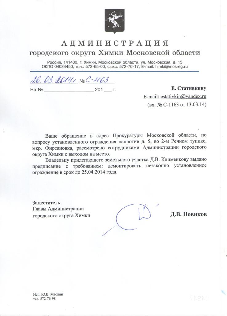 получено уведомление Сходненского ОП УМВД России по г. о. Химки, подписанное начальником Сходненского ОП УМВД России по г. о. Химки Ишмаковым Ф. Т. Принято решение об отказе в возбуждении уголовного дела в отношении Клименкова Д. В. по сообщению о совершении преступления, предусмотренного ст. 330 УК РФ ("Самоуправство") на основании п. 2 ч. 1 ст. 24 УПК РФ. В постановлении № 4641 об отказе в возбуждении уголовного дела от 02.05.2014 и.о. дознавателя - участковый уполномоченный Сходненского ОП УМВД России по г.о. Химки майор полиции Григорьев А. Ю. пишет: "Из объяснения Клименкова Д. В. по существу поступивших обращений следует, что по факту своевременного неисполнения предписания должностного лица он был привлечен к административной ответственности и что в настоящее время данное предписание исполнено. С целью проверки данной информации был осуществлен выход на указанный адрес. Сведения о демонтаже забора нашли свое подтверждение, что подтверждается фотоматериалом".