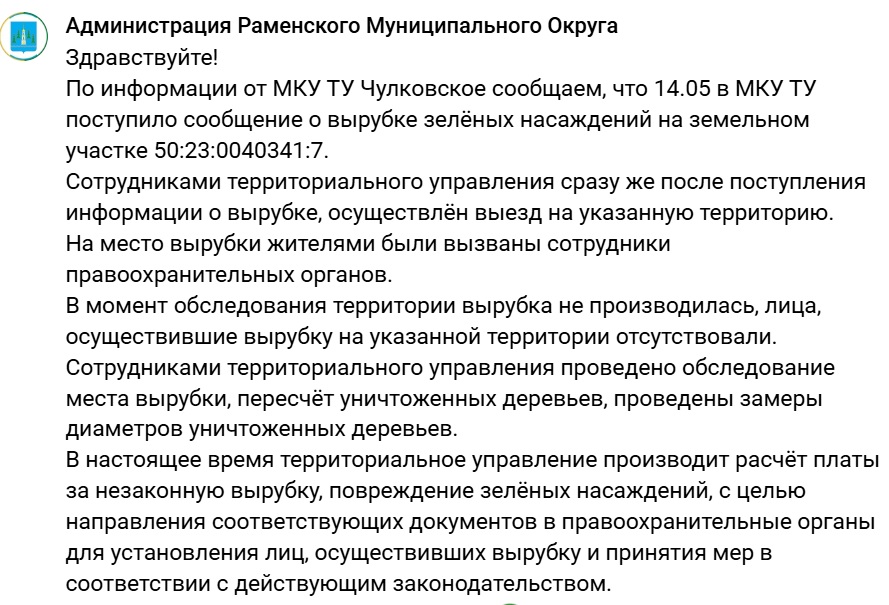 По этой информации, сотрудники ТУ Чулковское выехали на место - и не обнаружили там ни лесорубов, ни каких-либо работ. Спиленные деревья пересчитали, замерили и задокументировали. В данный момент местные власти готовят обращение в правоохранительные органы с целью установить и наказать виновных в незаконной вырубке зеленых насаждений, а также возместить ущерб за срубленный лес.