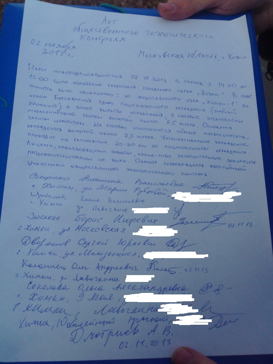 Защитники парка полагают, что там внезапно может начаться вырубка деревьев и строительство, поэтому нужно постоянное наблюдение за участком. На собрании было подписано заявление по поводу незаконности нового забора и необходимости демонтировать старый.