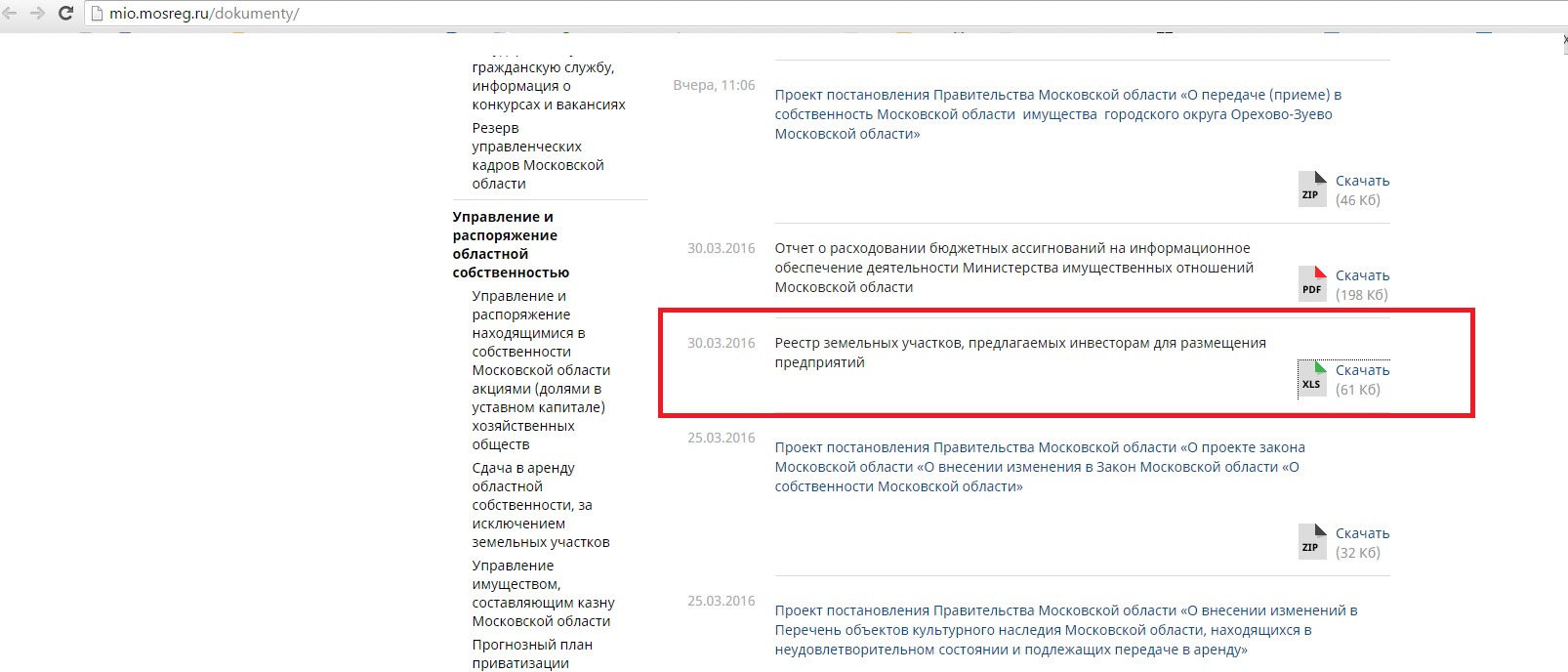 На сайте Министерства имущественных отношений Московской области, в разделе "Документы", 30 марта был размещен реестр участков, где в Подмосковье планируется разместить какие-либо предприятия: