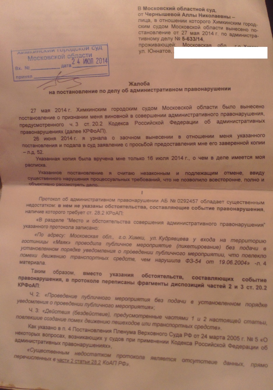 После этого правозащитник Андрей Маргулев подготовил кассационную жалобу на это решение, требуя признать рассмотрение дела без меня незаконным и прекратить дело за истечением срока давности (прошло уже более 3 месяцев). 21 июля кассация была подана, однако затем я заметила, что забыла поставить на ней свою подпись. 24 июля я исправила этот недостаток и принесла в суд исправленную жалобу.
