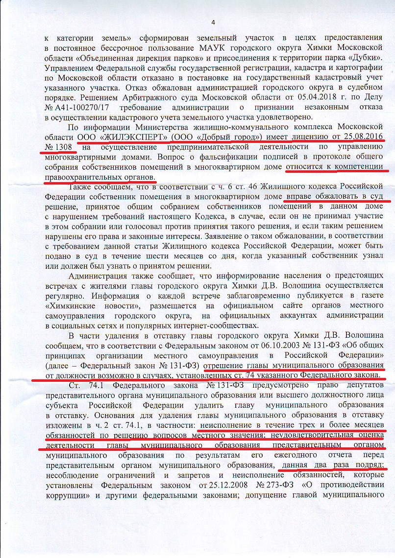 В-четвертых, что касается компании ООО "Добрый город", под управление которой тайком, без ведома жителей, переводятся многоквартирные дома в Химках, то она работает на рынке ЖКХ на законных основаниях, по лицензии. А если есть какие-то нарушения в ее действиях, то нужно обращаться в правоохранительные органы и суд, советует Федосеев.