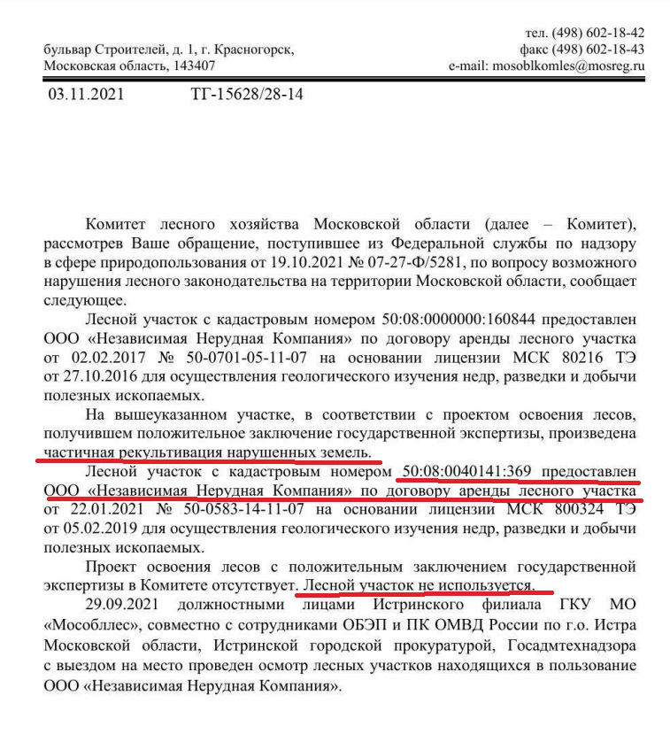 Комитет лесного хозяйства Московской области по-прежнему не принимает никаких мер в связи с уничтожением леса, хотя добыча полезных ископаемых на землях лесфонда запрещена. Свежий ответ по данному вопросу поступил от главы ведомства Елены Казимир 3 ноября.