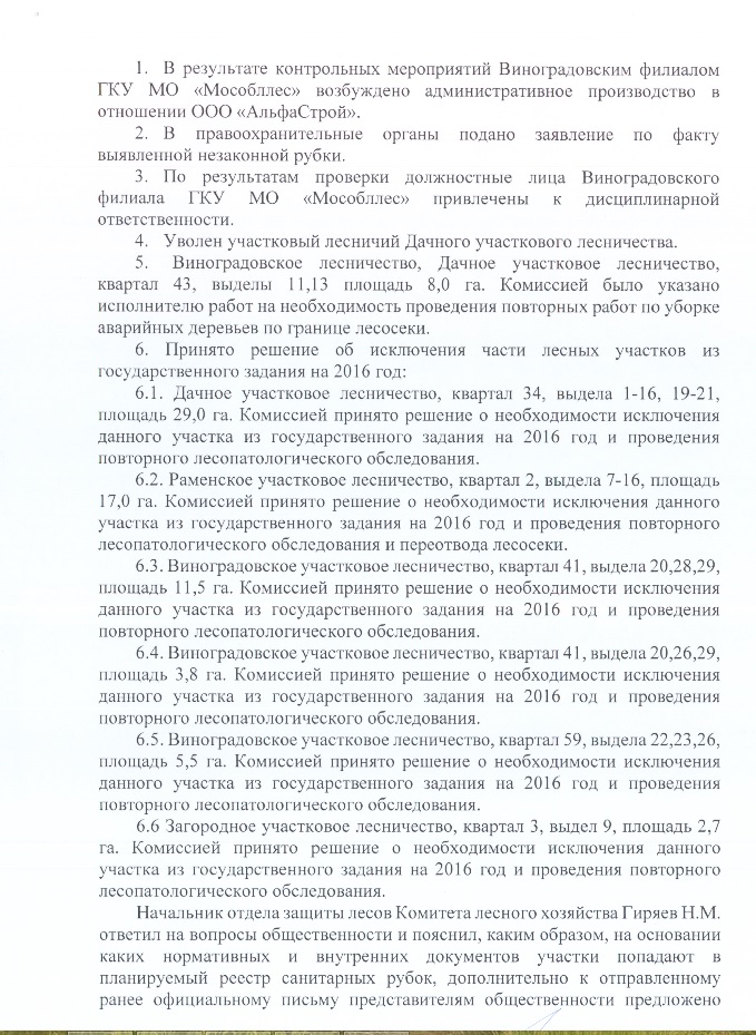 Защитники Раменского леса получили из Комитета лесного хозяйства Московской области итоговый протокол по результатам встречи чиновников с жителями, подписанный зампредом Комитета Рустамом Рзаевым. Согласно ему, по вырубкам в лесах Раменского района заведены административные дела, уволен начальник лесничества, подано заявление в правоохранительные органы. В лесу будут проведены дополнительные лесопатологические исследования с участием общественности. Шесть участков на сегодня исключены из реестра санрубок-2016. Сплошные санитарные рубки на территории района в 2016 году отменены, а на вырубленных в 2015-м участках будет проведено лесовосстановление с участием общественности в 2016-2017 гг.