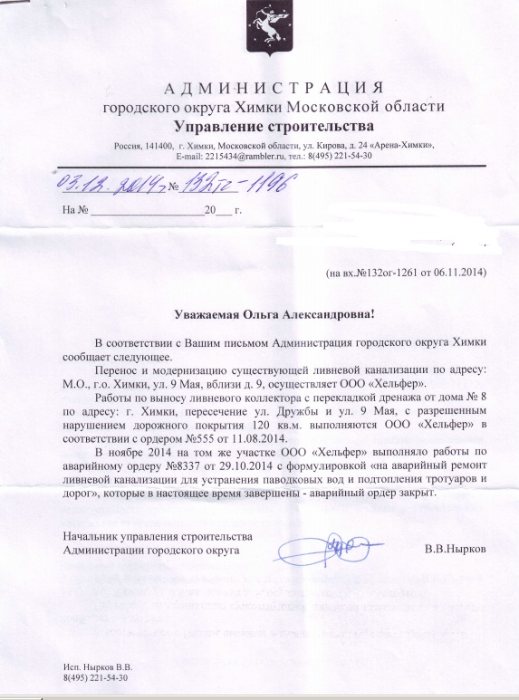 Первый - от главы строительного управления химкинской администрации Вячеслава Ныркова. В письме с проставленной датой от 3 декабря (то есть еще ДО пожара) говорится, что, оказывается, работы, названные "ремонтом ливневой канализации", уже завершены, а ордер на работы "закрыт".