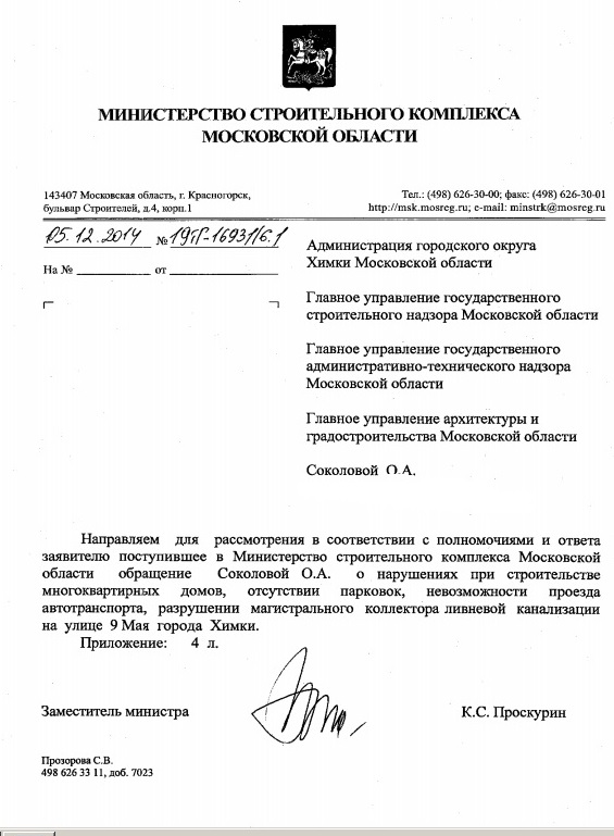 Одновременно, день в день с письмом Ныркова - 8 декабря, пришло письмо из правительства Московской области, от замминистра строительного комплекса Кирилла Проскурина, где он просит разобраться с нарушениями, имеющими место в 5-м микрорайоне. В письме проставлена дата - 5 декабря (получается, что опять ДО пожара, случившегося в ночь с 5-го на 6-е)